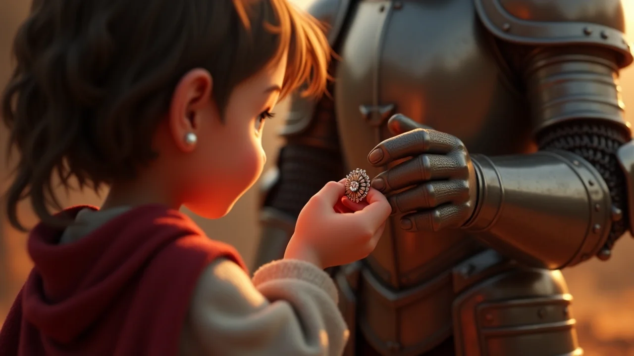 Артур хотел было закричать и потребовать кубок назад, но ты остановил его жестом. Ты почувствовал, что здесь кроется какая-то тайна. Подойдя ближе, ты заметил, что рыцарь пытается починить маленькую металлическую брошь в виде цветка, но его огромные пальцы в перчатках только ломали хрупкие детали.