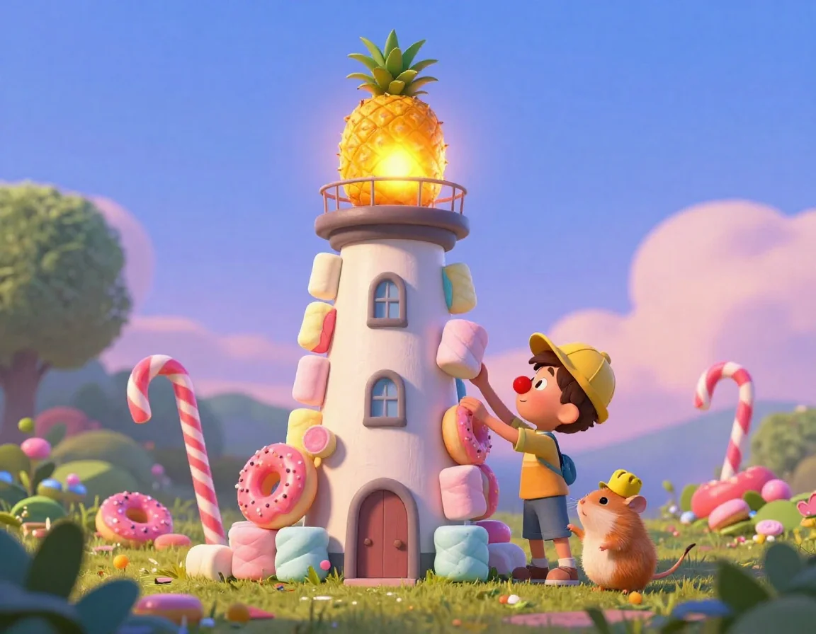 — Чих-Пых, тащи фонарь! — скомандовал я. Мой верный друг-хомяк, пыхтя от усердия, затащил на самую вершину огромный спелый ананас, который мы предварительно обмазали светящимся вареньем из светлячков (шучу, это был просто очень яркий жёлтый джем!).