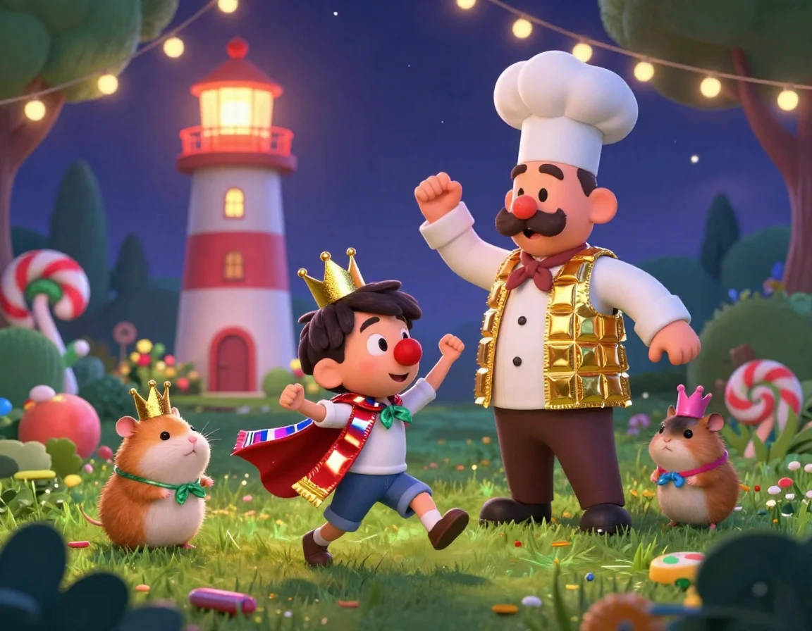 Даже корову Зорьку не обделили вниманием. Мы привязали к её рогам самые блестящие фантики, и теперь она была похожа на сказочного единорога, который очень любит сено. Мы включили старый граммофон, и началось безумие! Мы танцевали «Шуршащую кадриль» вокруг нашего мармеладного маяка. Фантики сверкали в лучах света, отражая тысячи маленьких зайчиков на стены дома и деревья.