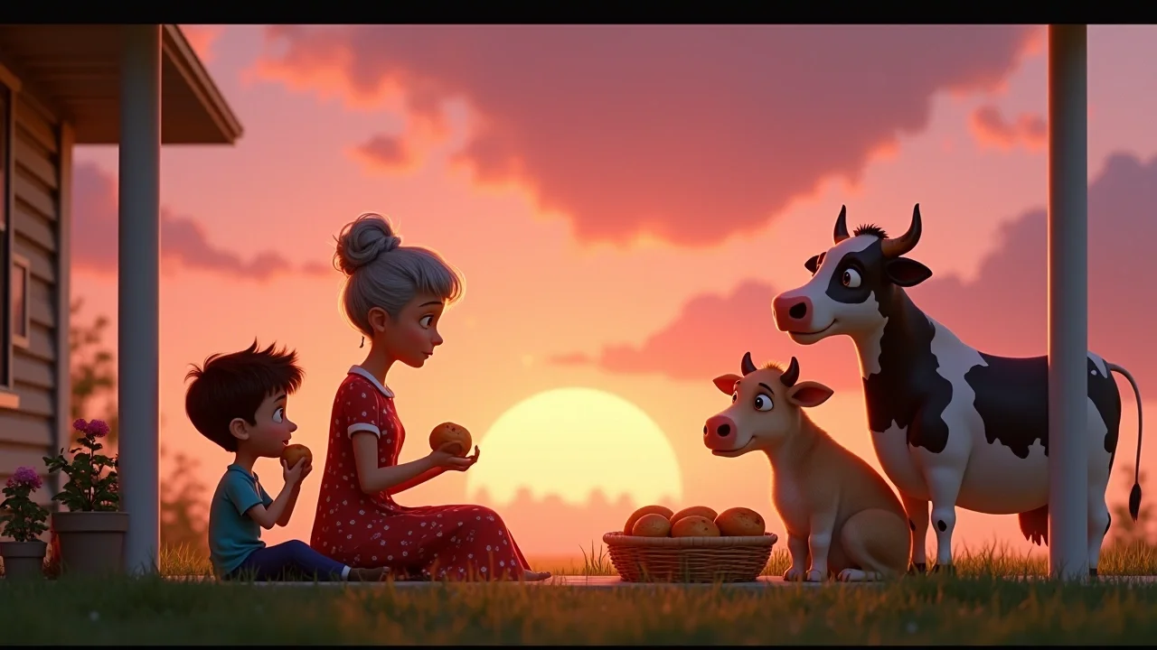 Мы все замерли от этой нелепой картины: корова вальсирует, почтальон в сахарной пудре поёт про новости, а бабушка Поля дирижирует половником. Я посмотрел на них и почувствовал, как в груди становится тепло. Как же здорово, когда все вокруг улыбаются! Мы присели на крылечко, бабушка раздала всем плюшки. Мы смотрели, как солнце медленно садится, окрашивая небо в розовый цвет, похожий на малиновое варенье.
