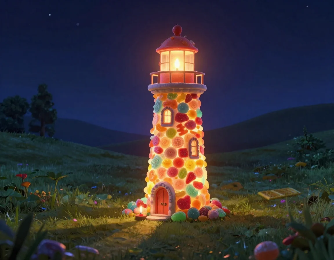 Вечерело. Мы зажгли внутри маяка маленькую свечку, и весь сад озарился волшебным разноцветным светом. Мармеладные стены пропускали лучи, рисуя на траве причудливые узоры.