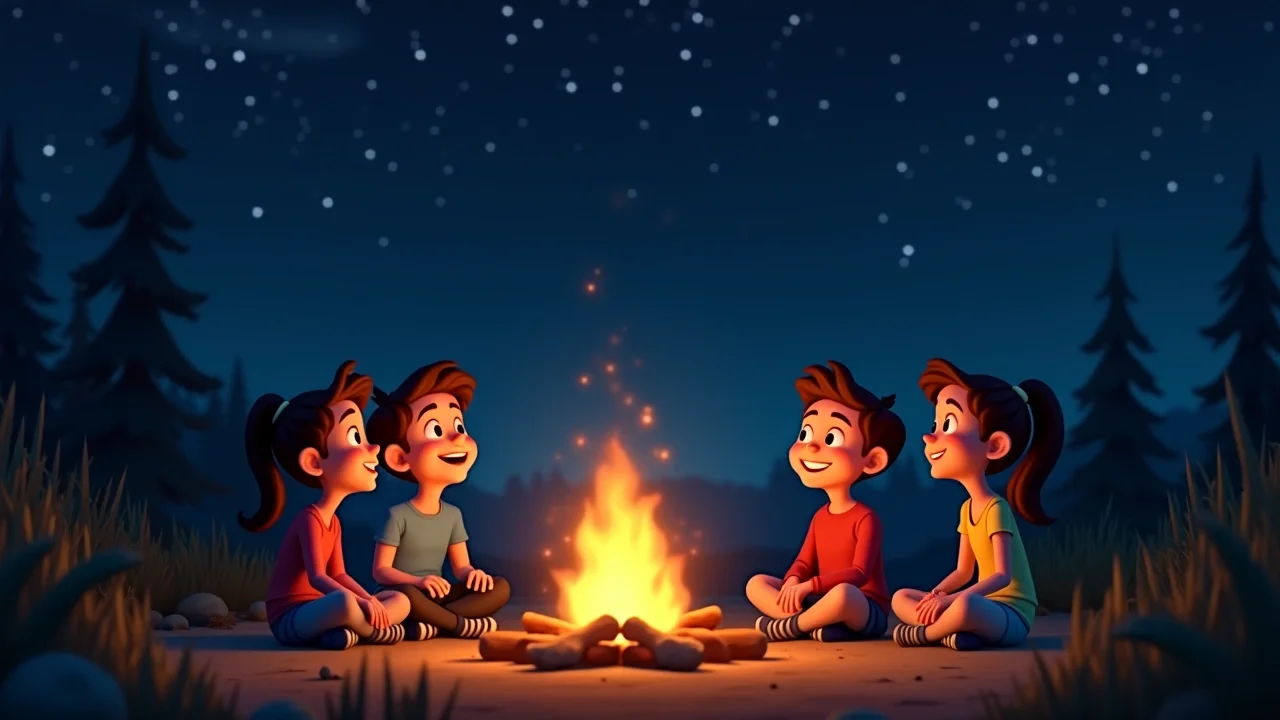 Когда суматоха улеглась, мы разожгли костёр. Было так уютно сидеть всем вместе под огромными звёздами, которые казались крошечными светящимися плюшками на тёмном блюде неба. Я понял, что даже если твои изобретения работают не так, как надо, доброта и смех всегда исправят любую ситуацию. Мы сидели в тишине, слушая сверчков, и я чувствовал, что это самый лучший и самый правильный вечер на свете.