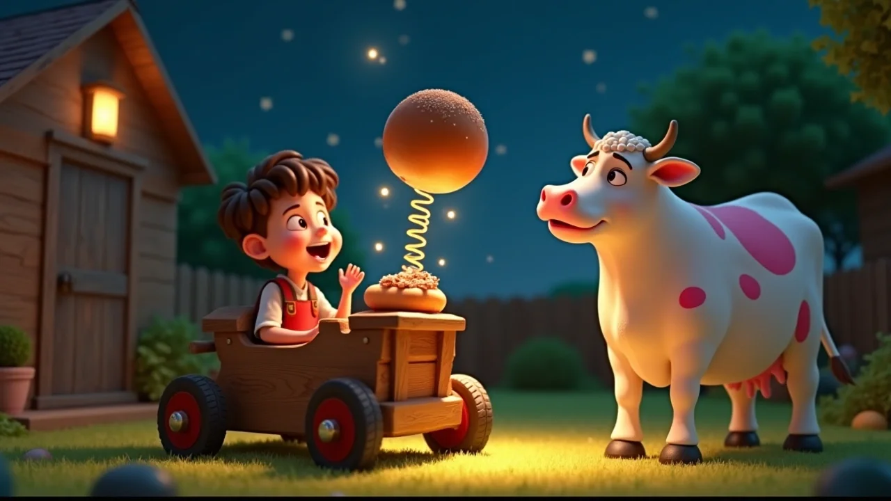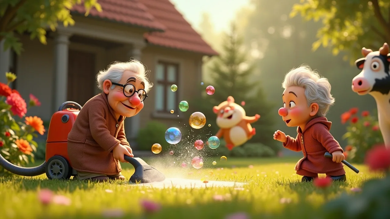 В этот момент мой пылесос издал странный звук: «Хрюк-буль-плюх!». Вместо того чтобы чистить крошки, он вдруг начал играть весёлую музыку, которую я записал на старую кассету. Корова Зорька, прибежавшая за нами, начала танцевать вальс, наступая на хвост воображаемому кавалеру.