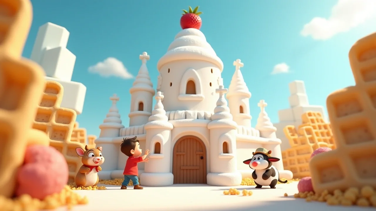 — Смотрите, — гордо сказал дядя Стёпа, прилепляя с помощью густого малинового сиропа окна из леденцов. — Это не просто замок, это настоящий «Сладко-Град»! Здесь даже ворота открываются со звуком «Хрусть-хрусть»!