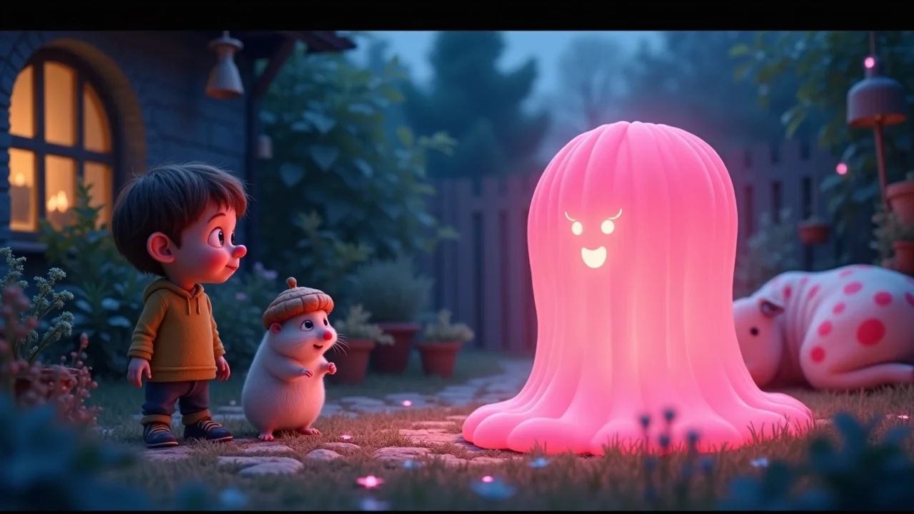 Вдруг за забором послышалось странное: «Шлёп... шлёп... хлюп...». Из темноты медленно выплыло нечто розовое, светящееся и очень шаткое. Оно покачивалось из стороны в сторону и издавало звуки, напоминающие довольное урчание.