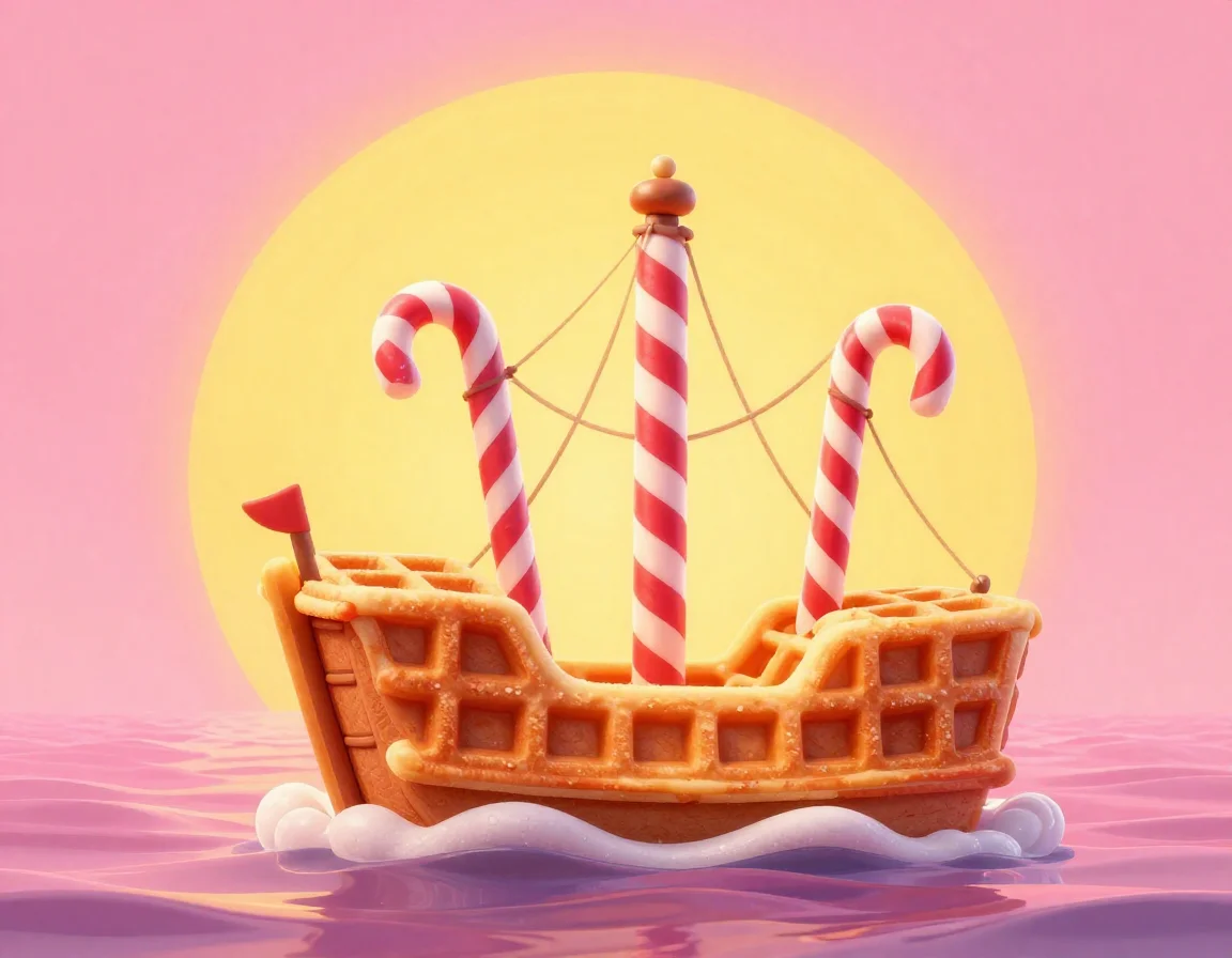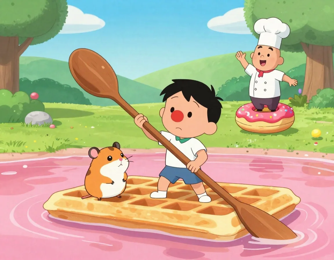 Двор окончательно превратился в мелкое лимонадное озеро. Мы с Чих-Пыхом вооружились гигантскими деревянными ложками вместо вёсел. «Хлюп-шлёп!» — наш вафельный плот медленно отчалил от крыльца. Вафля смешно похрустывала под ногами, впитывая розовый сироп, но держалась стойко.