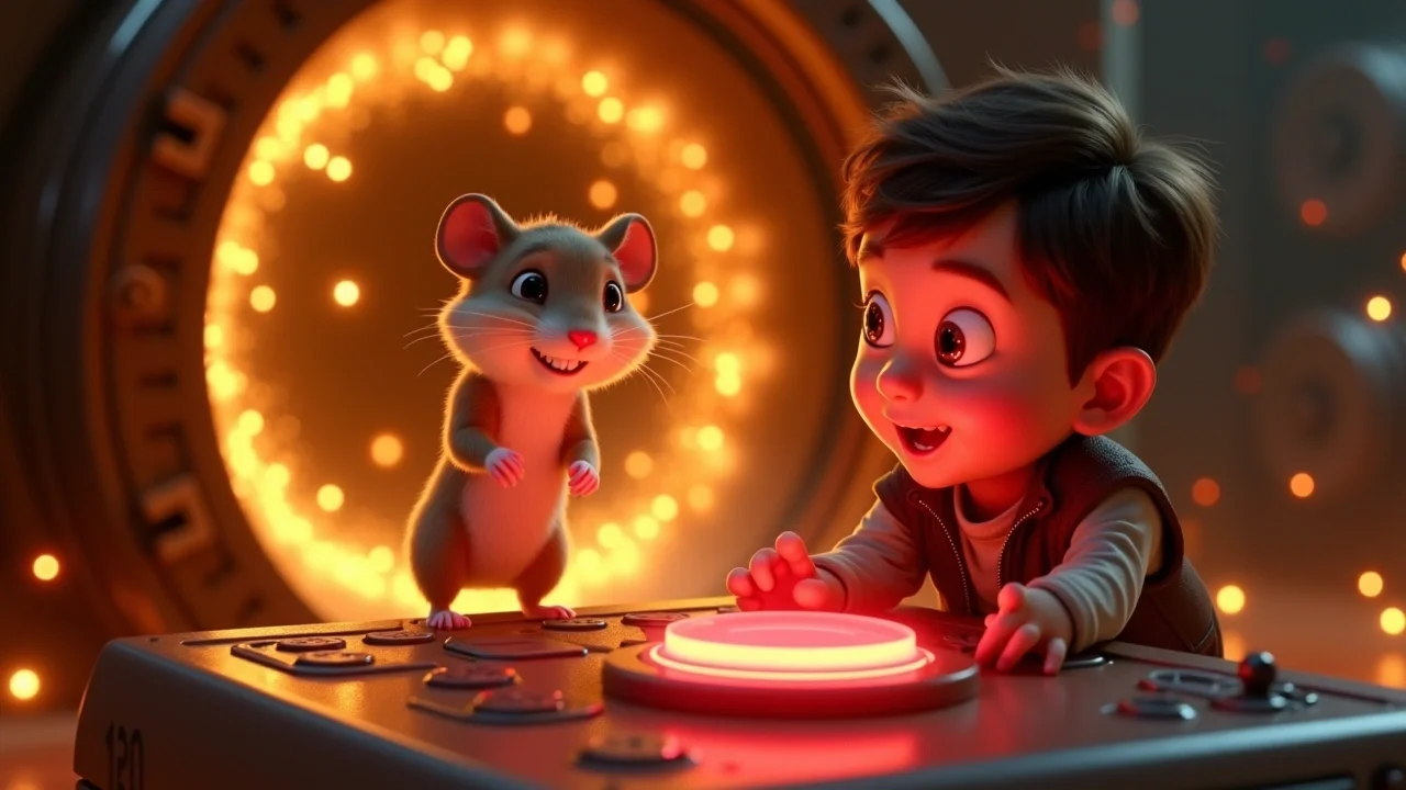 Мы влетели прямо в открытый люк Пылесоса. Внутри всё сверкало и гудело: «Бззз-миу-миу!». Прямо перед нами на панели управления сияла ОНА — огромная, блестящая, красная кнопка с надписью «Сверх-смех: нажимать только в случае крайней скуки».
