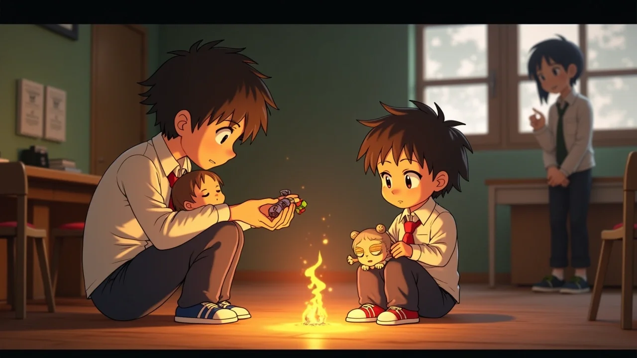 — Эй, Деку... — Бакуго запнулся, его обычный грубый тон сменился на хриплый шёпот. Он опустился на одно колено перед креслом Аизавы. — Прости за шум. Тот придурок с шарами на голове больше тебя не напугает. Я... я лично прослежу, чтобы в классе было тихо, когда ты рядом.