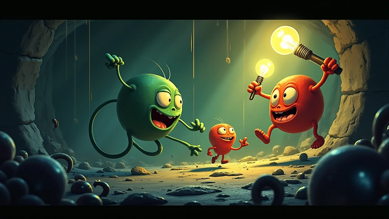 — Получайте, подделки! — вопил Шримпо, размахивая тяжёлым гаечным ключом. Он не просто отбивался — он защищал своих друзей. Каждый раз, когда чернильная масса пыталась подобраться к Гобу со спины, Шримпо оказывался рядом, разбивая тёмные сгустки точными ударами.