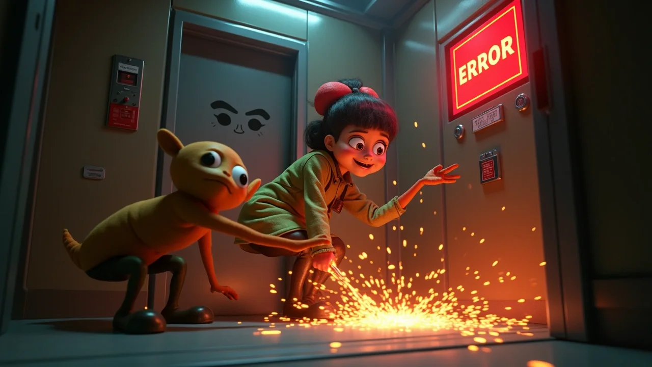 Ветер свистел в щелях падающей кабины, а стены лифта вибрировали так сильно, что казалось, они вот-вот рассыпаются на пиксели. Поппи подскочила к панели управления и одним резким движением сорвала защитную крышку. Внутри вместо привычных проводов пульсировали живые чернильные вены, переплетённые с медными кабелями.