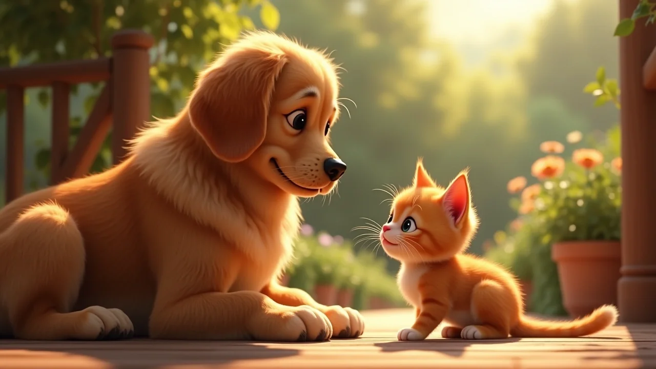 Однажды Лучик залез слишком высоко на книжную полку и побоялся прыгать вниз. Он жалобно замяукал. Барон тут же прибежал на помощь. Он подставил свою широкую спину, чтобы котёнок мог мягко спрыгнуть на него. С того дня они стали неразлучны. Собаки и кошки могут отлично ладить, если их знакомство проходит постепенно и в спокойной обстановке.