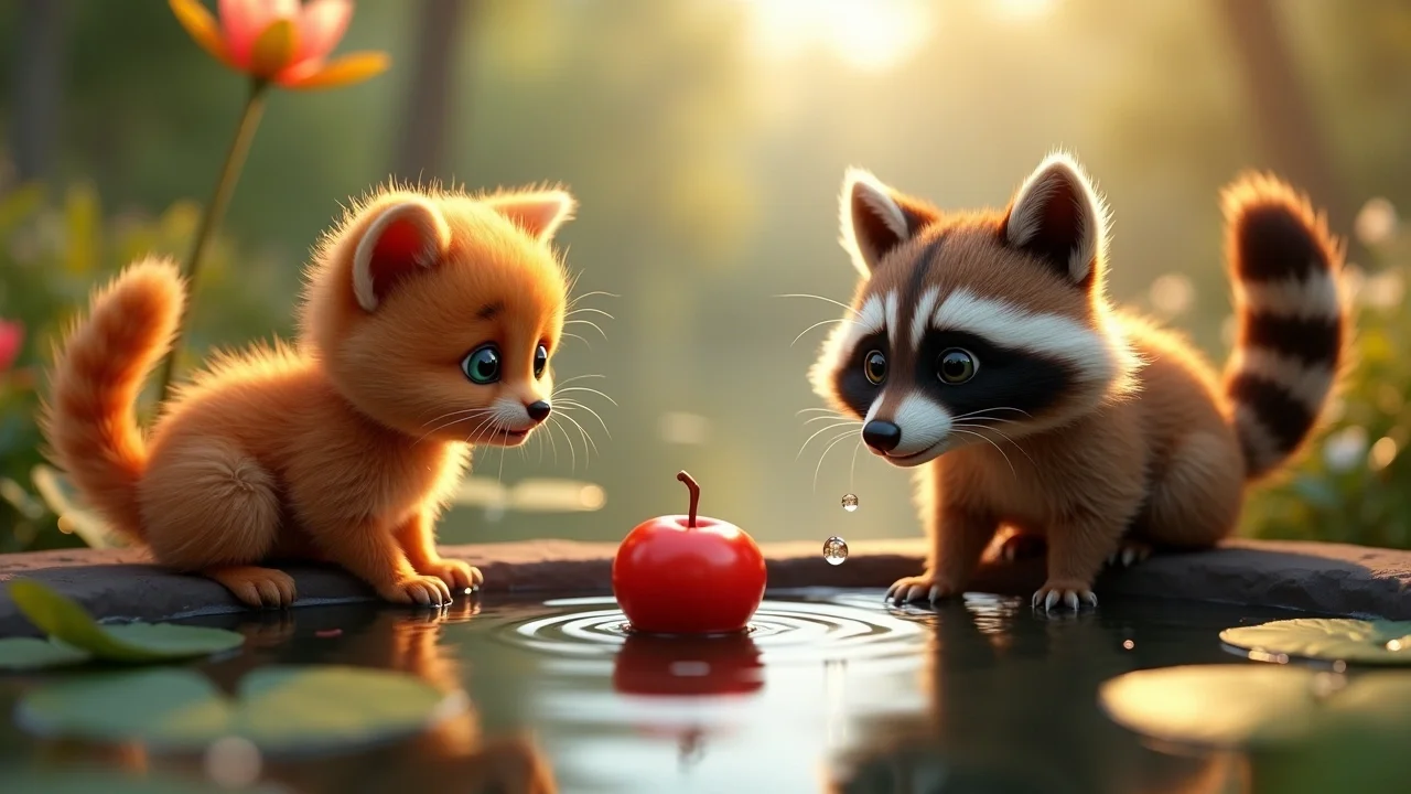 Утро на даче началось с густого тумана, который стелился по земле, словно пушистое белое одеяло. Лучик и Барон отправились к небольшому пруду в конце сада. Там, среди широких листьев кувшинок, они заметили странного зверя в полосатой маске. Это был енот!