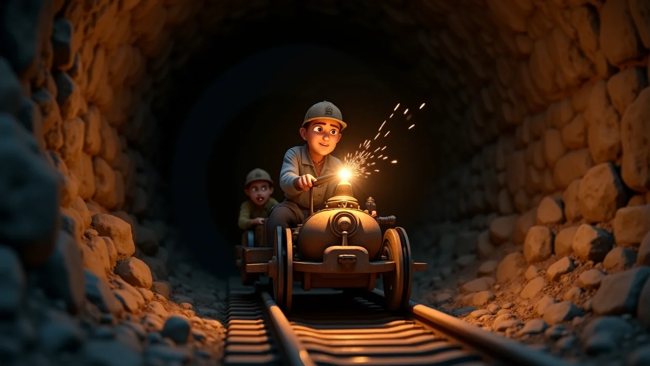 Нил изо всех сил нажимал на рычаг, ускоряя их бег. Ветер, пахнущий сырой землёй и плесенью, свистел в ушах. Стены шахты сливались в серую полосу. Фонарик в руке Эндрю выхватывал из темноты то обвалившиеся подпорки, то брошенные инструменты, которые проносились мимо, как призраки прошлого.