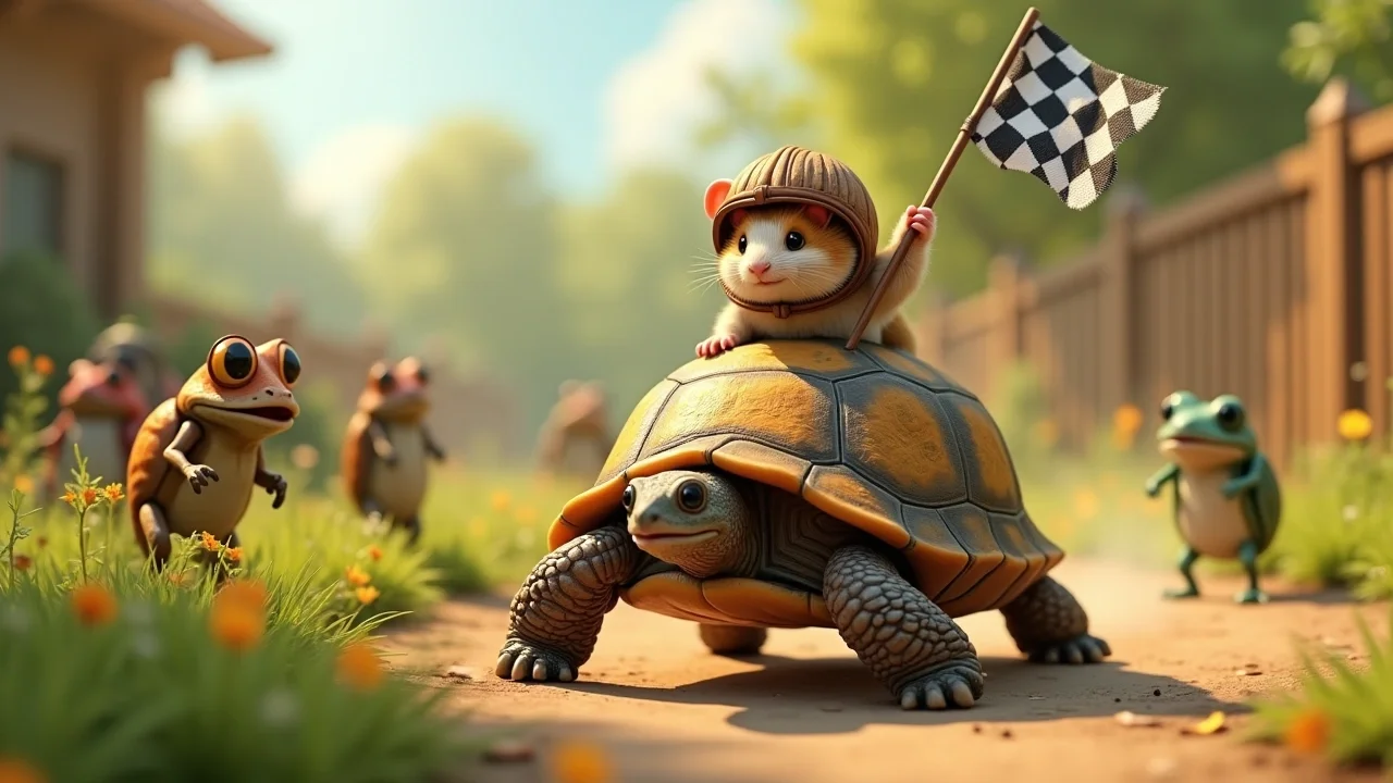 На стартовой линии выстроились самые быстрые... ну, или самые старательные гонщики джунглей. Чих-Пых оседлал черепаху по имени Молния. Молния была настолько медленной, что на её панцире успел вырасти небольшой кустик мха, пока она шла к старту. «Тр-р-р-ру!» — завел воображаемый мотор Чих-Пых, крутя воображаемый руль.
