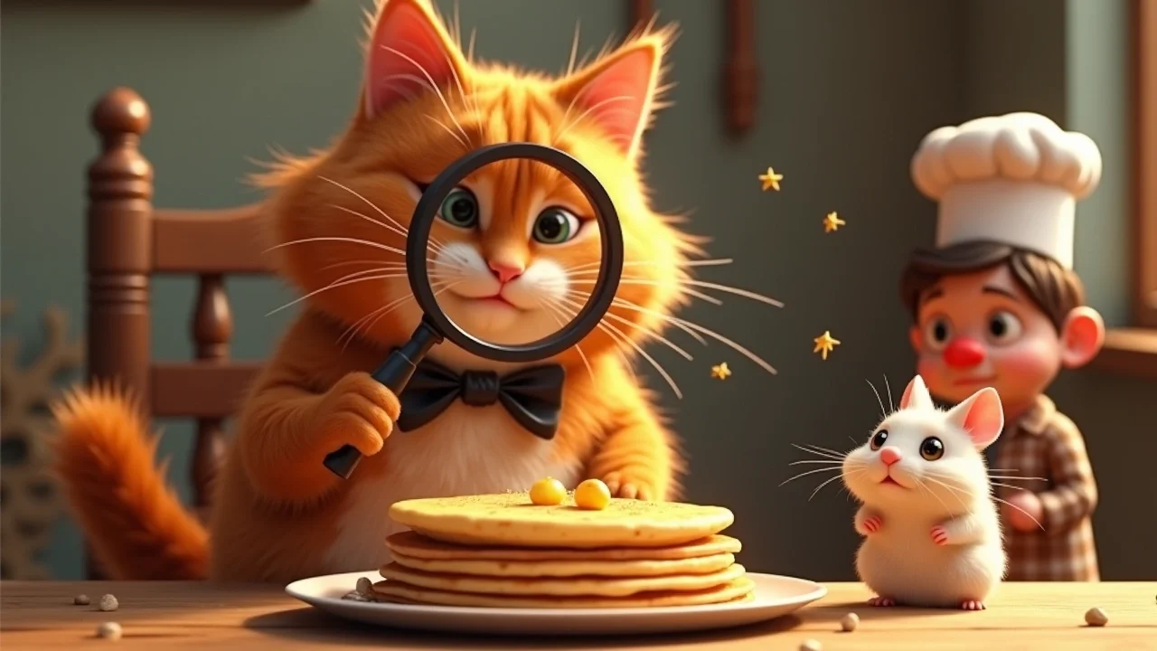 Оладушки, завидев кота, запели ещё громче, перейдя с блюза на тяжёлый рок: «Бам-бам! Мы вкусные как дам!». Мурчелло прищурился, подошёл к тарелке и... вместо того чтобы съесть артистов, начал дирижировать хвостом! «Вжих-вжих!» — его хвост летал из стороны в сторону, задавая темп.