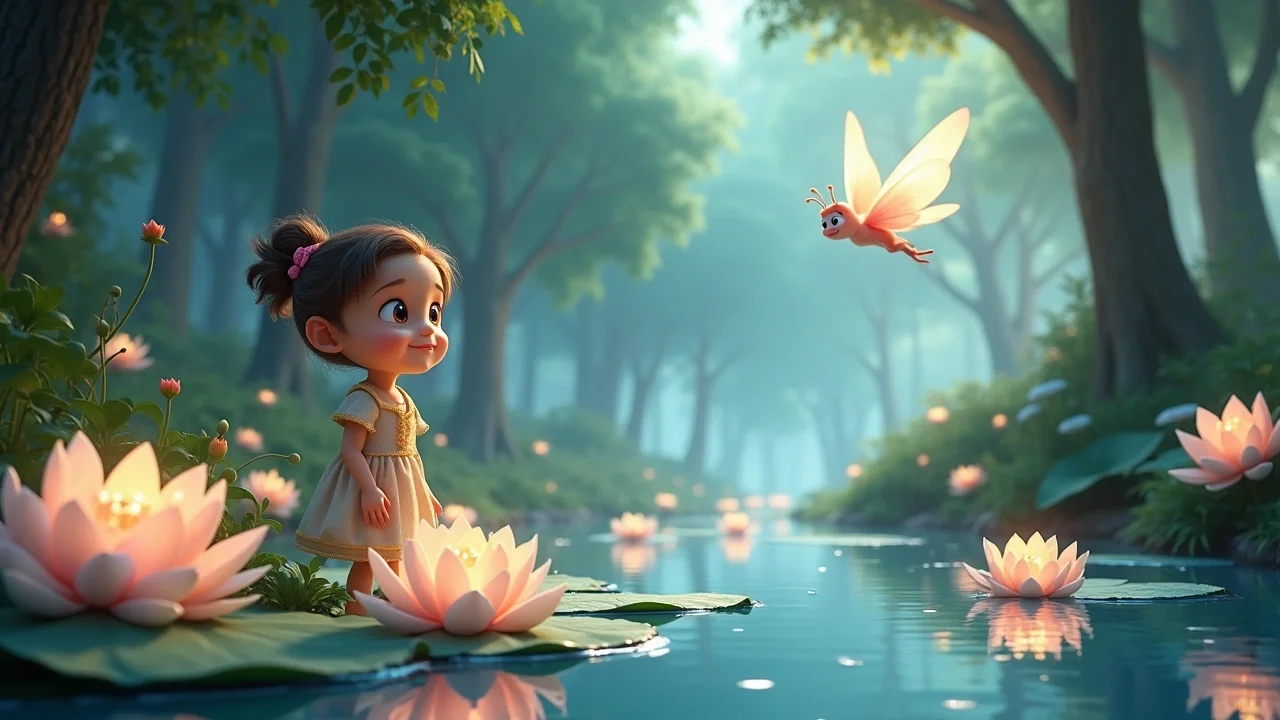 «Давайте построим мостик!» — предложила милая Елизавета. Как только она это произнесла, кувшинки начали медленно двигаться, выстраиваясь в ровную дорожку. Каждая кувшинка светилась нежно-розовым светом. Елизавета осторожно сделала первый шаг. Ой! Кувшинка была мягкой, как батут, и под её ножкой раздался тихий звук, похожий на звон маленького колокольчика: «Динь!»