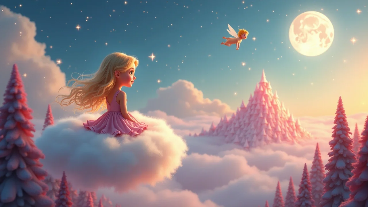 Елизавета подошла к пушистому облаку и легонько коснулась его пальчиком. Оно было тёплым и мягким, совсем как сахарная вата! «Милое облако, — ласково обратилась к нему Елизавета, — не могло бы ты помочь нам подняться на вершину Сахарной Горы? Нам очень нужно найти колокольчик для Звёздного Мишки».