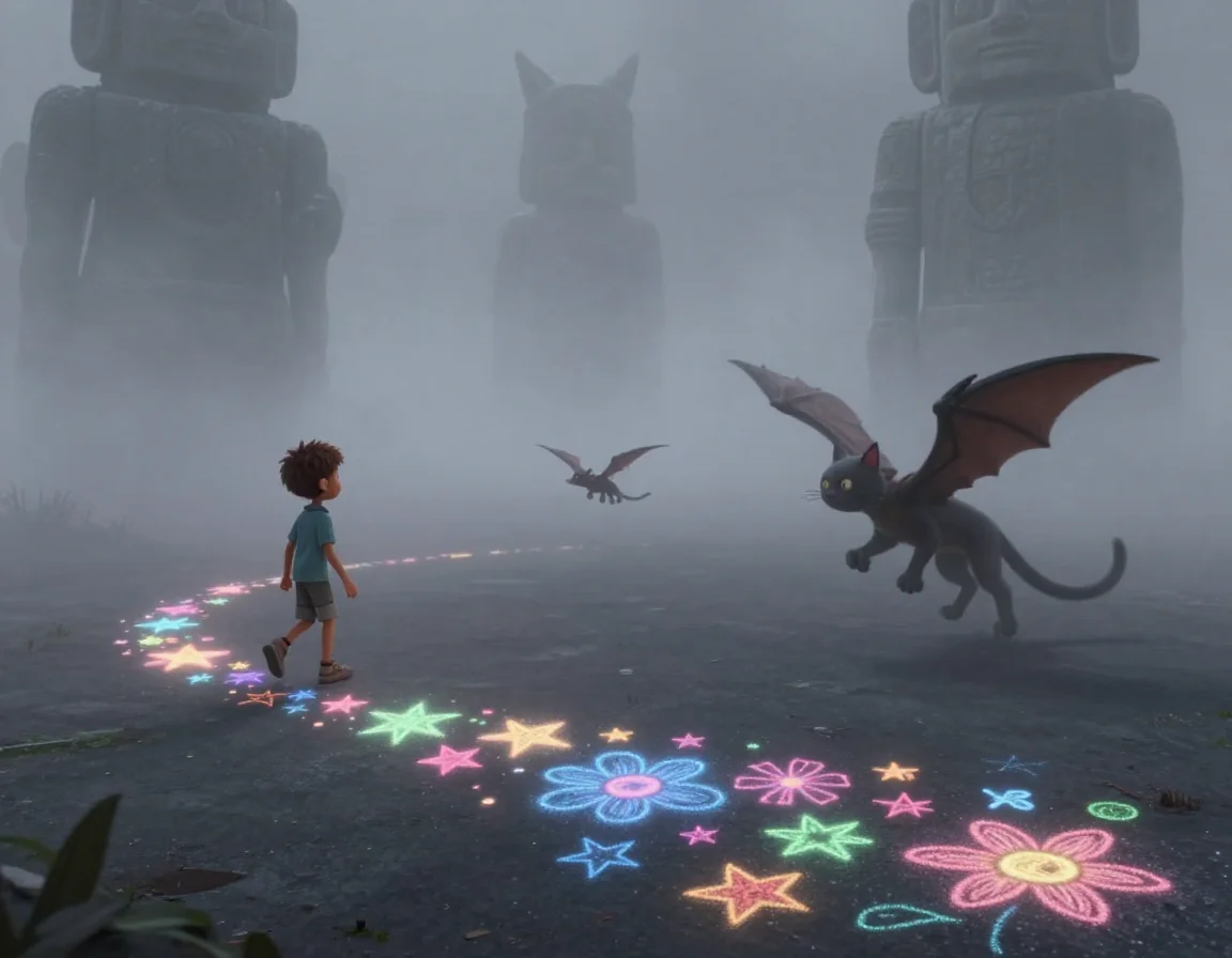 Артём решил, что самый надёжный путь — это тот, который ты освещаешь сам. Он достал свои самые яркие мелки и начал рисовать прямо на камнях и тропинке. С каждым его движением на земле расцветали светящиеся подсолнухи, вспыхивали неоновые звёзды и тянулись золотые ленты. Этот защитный пояс из рисунков раздвигал густой серый Туман, словно тёплый нож масло.