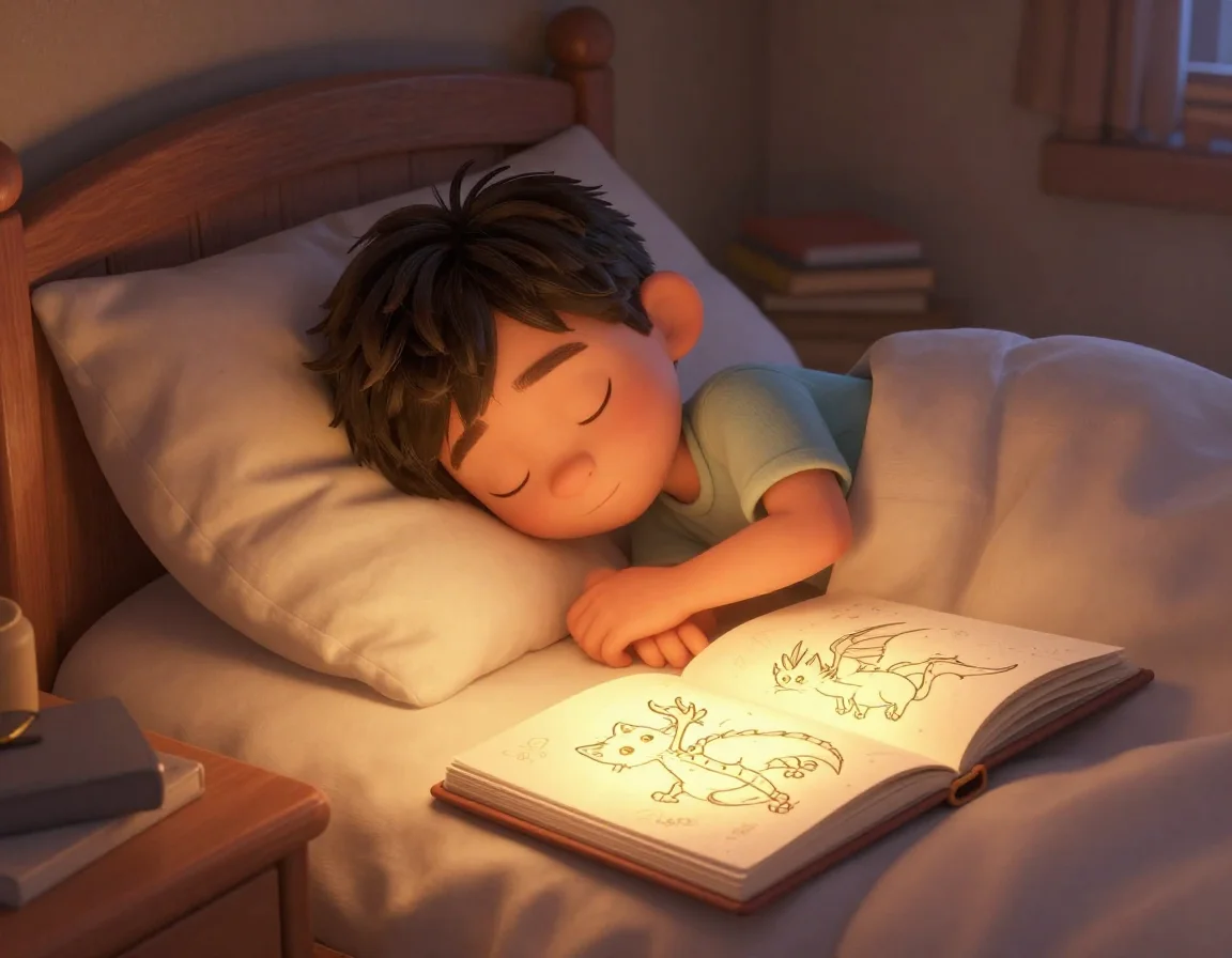 Артём почувствовал, как его глаза слипаются. Он обнял своих новых друзей — тёплого Искорку и пушистого Слухача. Мир вокруг начал медленно превращаться в уютную комнату на чердаке. Он засыпал с улыбкой, зная, что завтра он нарисует ещё много удивительных вещей.