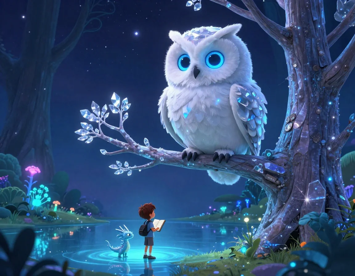 Над водой, на ветке хрустального дуба, сидела огромная белая сова. Её перья светились, словно были сотканы из инея, а глаза напоминали две большие полные луны. Это была Мудрая Сова Глафира, хранительница снов и забытых историй.