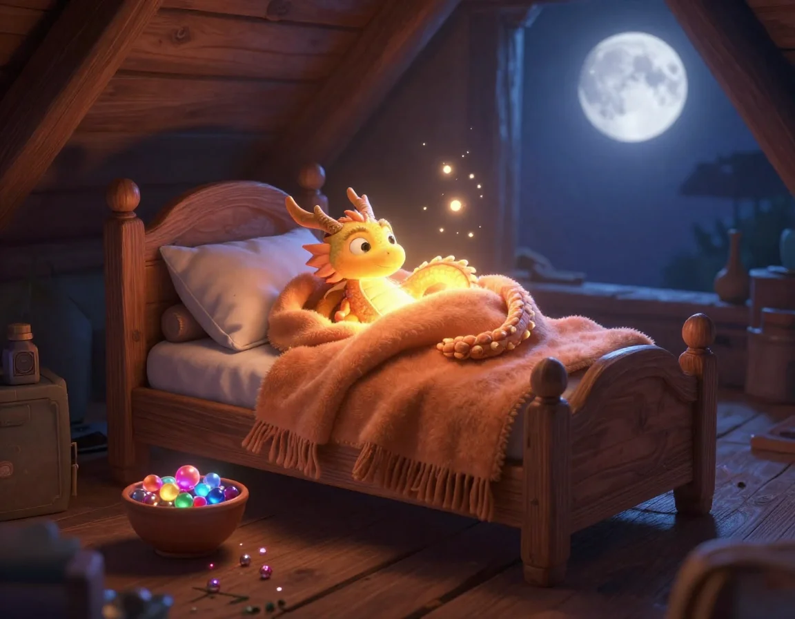 Однажды вечером, когда небо окрасилось в цвет черничного варенья, Артём поднялся на чердак своего дома. Там, среди старых книг и коробок с игрушками, он заметил странное мерцание. Присмотревшись, он увидел крошечного дракончика размером не больше котёнка. Его чешуя переливалась всеми оттенками осени: от золотого до багряного, а крылышки были прозрачными, как сухие листочки.