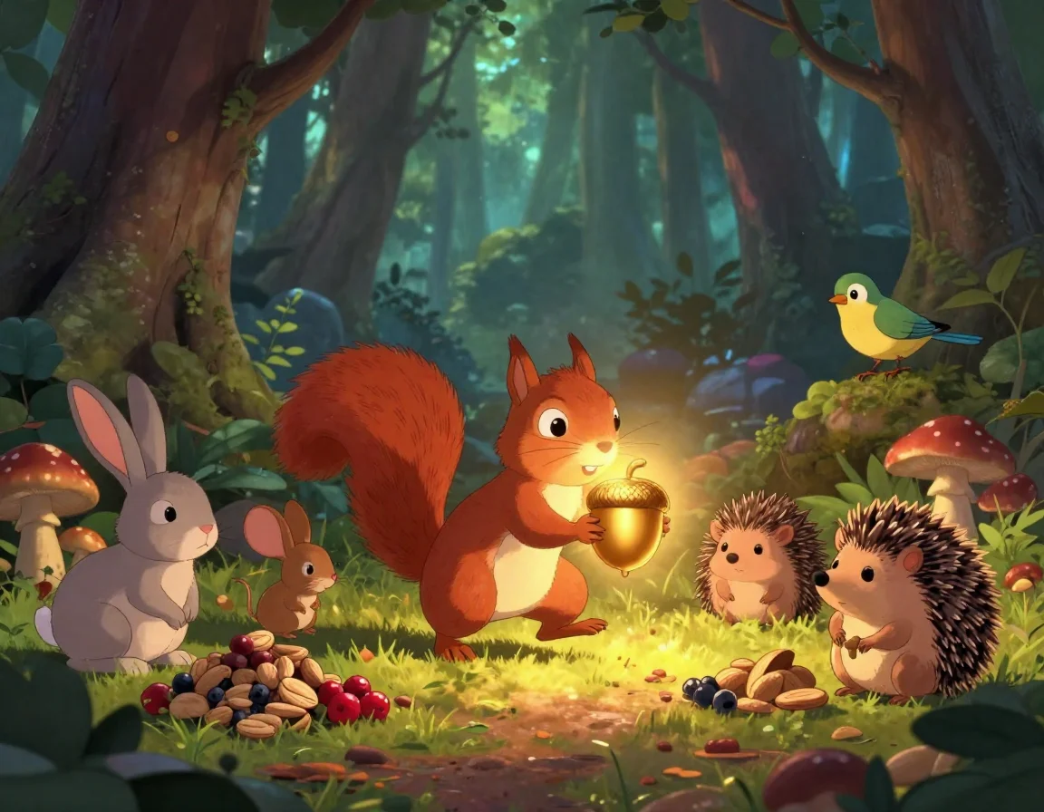 Однажды, когда осень уже раскрасила листья в багрянец, Мила нашла на самой вершине Векового Дуба необычный орех. Он был не коричневый и не зелёный, а сиял чистым золотом. Это был легендарный Золотой Орех Доброты. Старики сказывали, что такой орех даётся только тому, кто за весь год никого не обидел и ни в одной просьбе не отказал.
