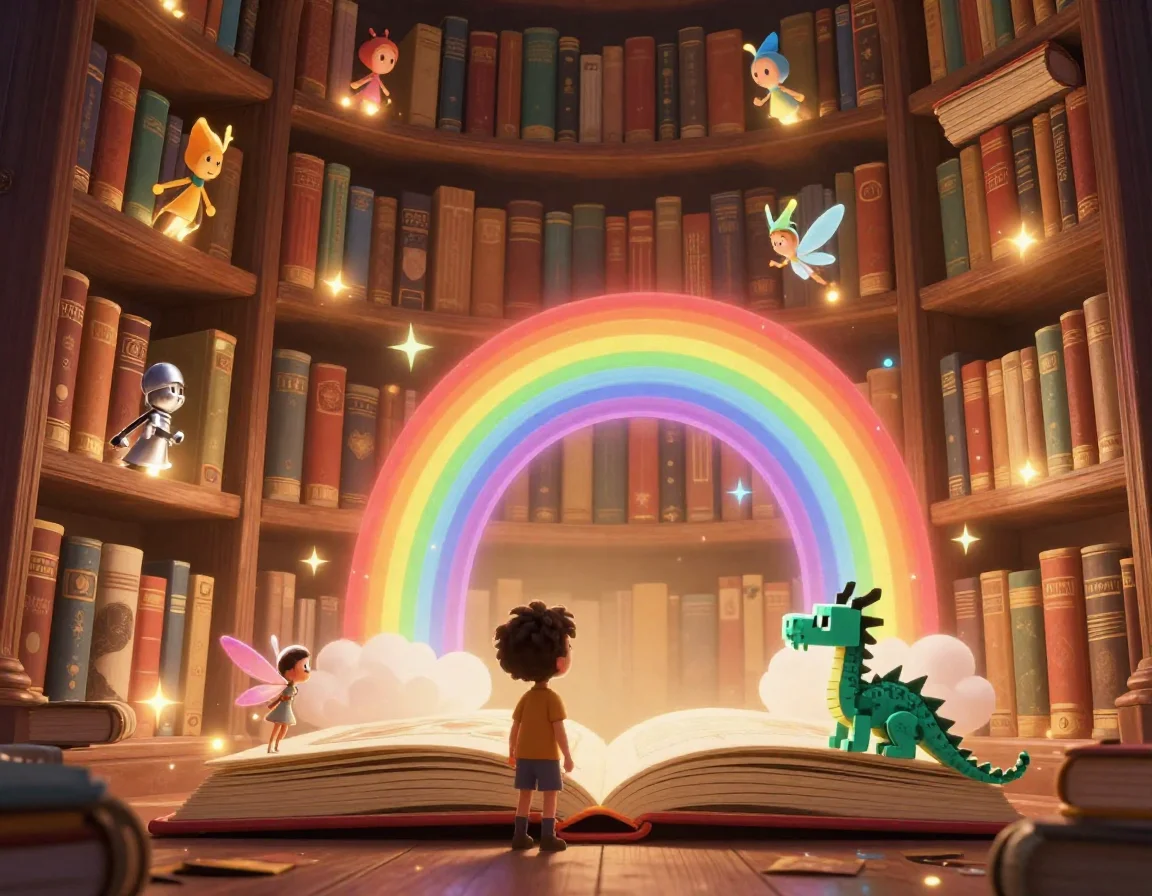 Вы направились к Стеллажу Сказок, который возвышался до самого потолка, скрытого в золотистой дымке. Книги здесь не просто светились — они жили! Из одной книги доносился шум морского прибоя, из другой — звон рыцарских доспехов. Как только вы приблизились, огромный том в кожаном переплёте сам собой раскрылся у ваших ног.