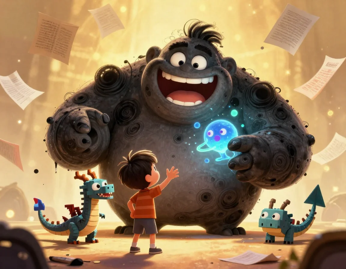 Чернильный Страж сначала замер, его тёмные края начали подрагивать. А потом... раздался звук, похожий на лопающиеся пузырьки краски. Страж захохотал! Его огромное тело из клякс начало светиться изнутри. С каждым твоим словом он становился всё меньше и ярче, пока не превратился в маленького, сияющего разноцветными искрами человечка.
