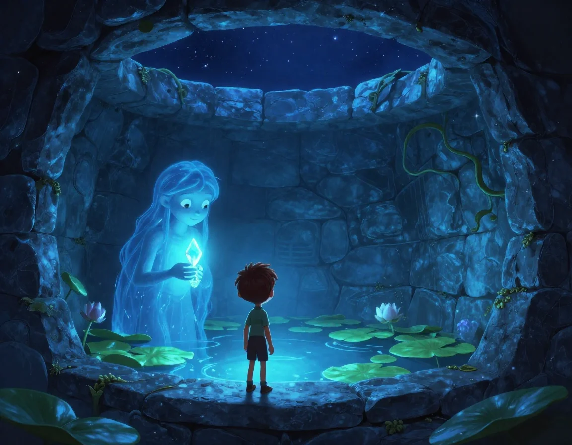 Из воды показалась голова, похожая на старую корягу, облепленную кувшинками. Это был Водяной Потат, хранитель подземных ключей. В руках он крутил тот самый Хрустальный Медальон. Медальон сиял в темноте, освещая чешуйчатые руки духа.
