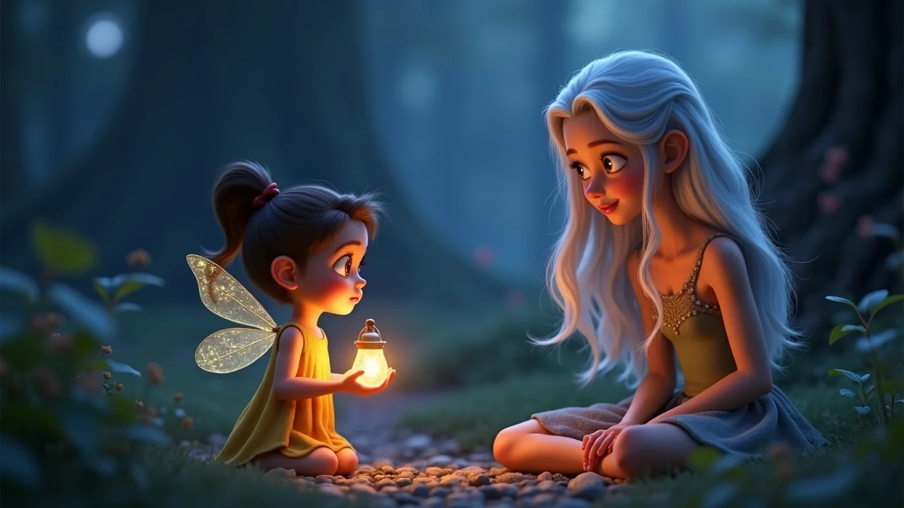 Когда Искорка наконец-то приблизилась к сияющему саду Феи Лунного Света, её сердце забилось ещё сильнее. Там, среди нежных лунных цветов и серебристых трав, парила сама Фея Лунного Света. Её волосы, сотканные из самого нежного лунного сияния, мягко струились по плечам, а глаза сияли мудростью и добротой.