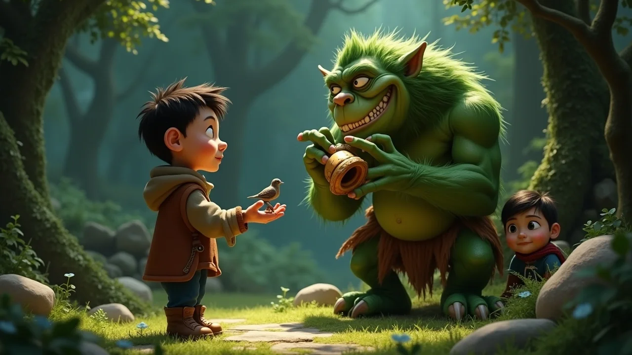 Тролль на какое-то время замер, его огромные глаза сфокусировались на маленькой деревянной птичке. Он почесал свой волосатый подбородок. Это было необычно. Никто никогда не предлагал ему что-то добровольно. Все обычно убегали, стоило ему только появиться. А тут — такая ценность, и с такой искренностью. Он чувствовал, как Камень Сердечной Доброты, что был у Сашки, излучал мягкое тепло, проникающее даже сквозь толстую шкуру Тролля, слегка смягчая его угрюмый нрав.
