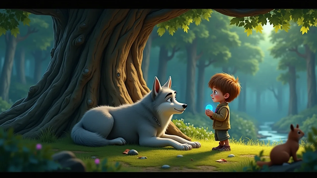 Наконец, он вышел на небольшую поляну, где под раскидистым дубом лежал огромный старый Волк. Его шерсть была седой, глаза мутные от возраста, а вздохи – тяжёлыми и грустными. Он не шевелился, лишь изредка поводил ухом, прислушиваясь к шорохам леса. Похоже, ему было очень плохо, и он, казалось, даже не заметил приближения Сашки.