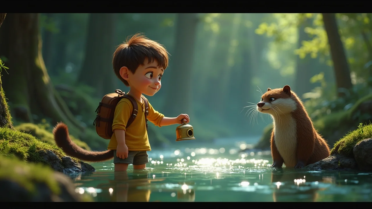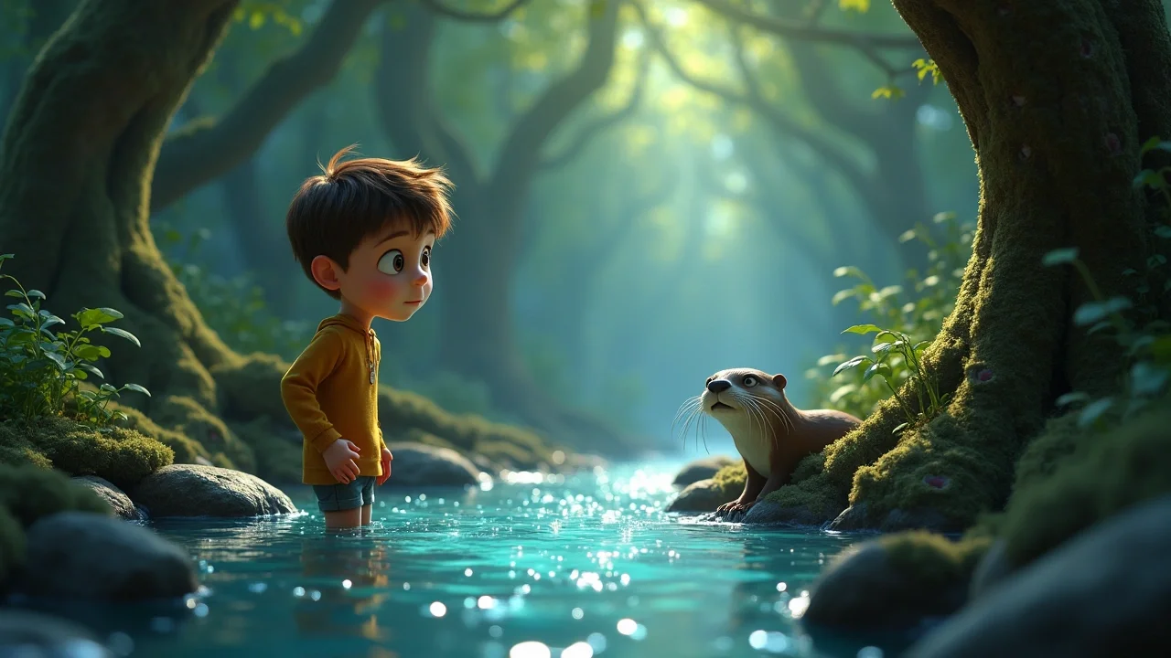 Подойдя совсем близко, Сашка заметил, что берега ручья были усыпаны незнакомыми, но удивительно красивыми цветами, каждый лепесток которых словно светился изнутри. Вода же в ручье была не просто прохладной — она казалась живой, поющей, а из её глубин доносился едва уловимый, но чарующий шёпот. Вдруг из-за большого замшелого камня выглянула пара блестящих, умных глаз. Это была старая, мудрая выдра по имени Выдринка, хранительница этого ручья. Её шёрстка была гладкой и тёмной, а движения — ловкими и изящными.