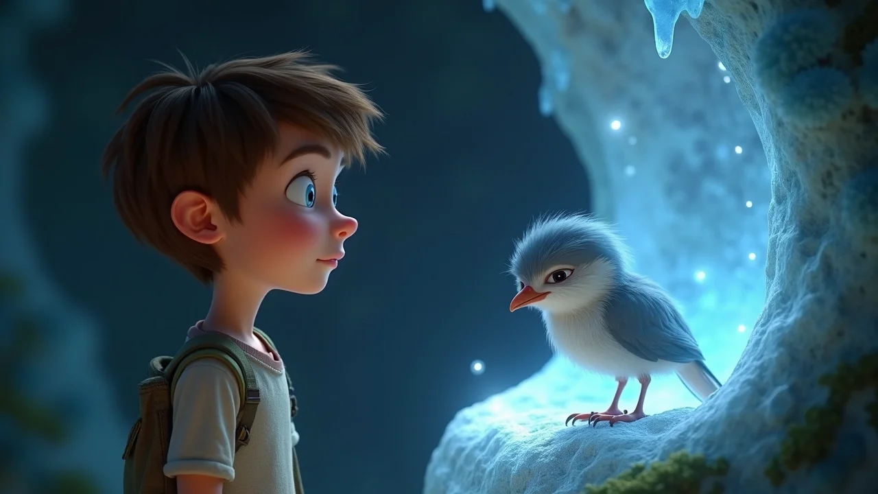 Его голос, словно ручеек, пробежал по хрустальным стенам, и эхо отнесло его к самой глубине уступа. Плач утих, а затем послышался тонкий, дрожащий писк. Из расщелины в хрустальной скале, куда даже солнечному лучу трудно было проникнуть, показалась крохотная птичка с тусклыми перышками. Ее глаза были полны печали, а голова поникла.