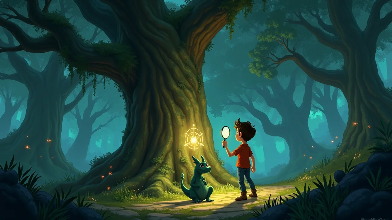 «Смотри, Дебаг! Какие удивительные узоры!» — прошептал Лукас, доставая свою любимую увеличительную лупу. Он осторожно прикоснулся к коре, чувствуя её шершавую поверхность. «Это не просто узоры, это руны! И они светятся!»