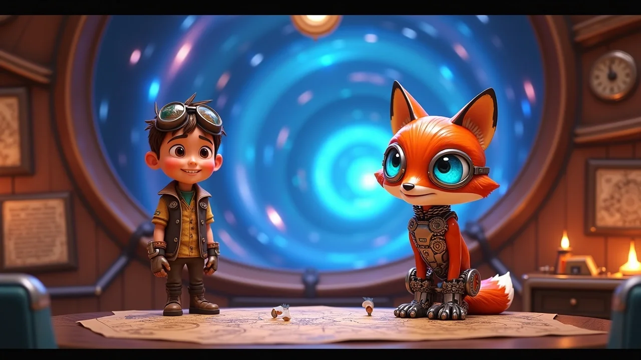 Утро в летающем доме-дирижабле всегда начиналось с особенного волшебства. Солнечные лучи, пробиваясь сквозь иллюминаторы, играли на полированных поверхностях старинных приборов и блестящих деталях Спарка. Механический лис, обычно такой энергичный, сегодня казался задумчивым. Его голубые глаза-индикаторы мерцали, когда он внимательно изучал карту, которую Алекс вчера нашёл в тайнике.