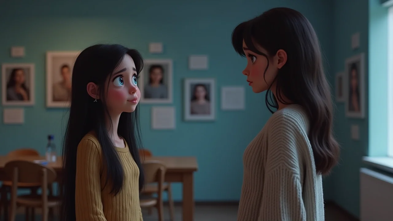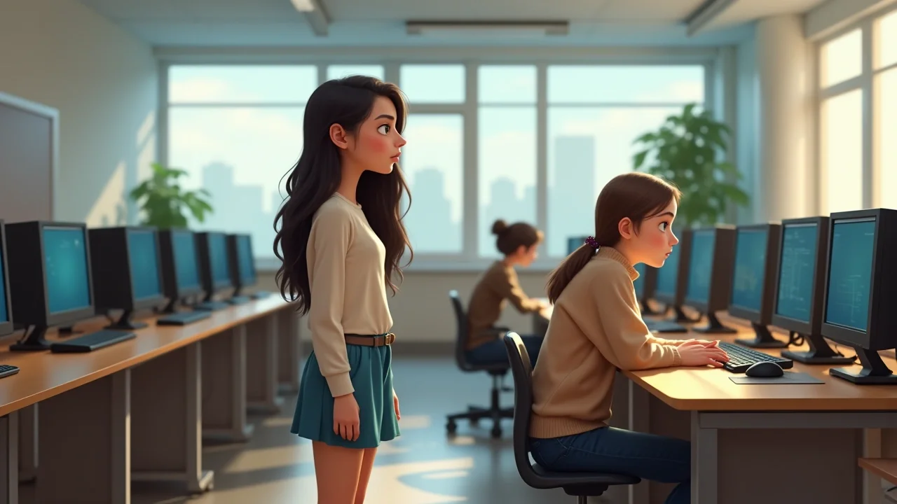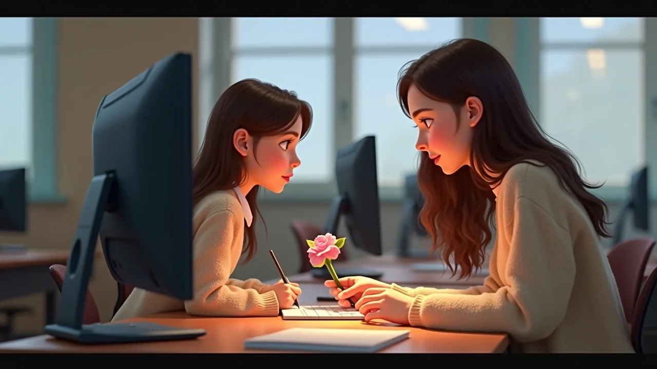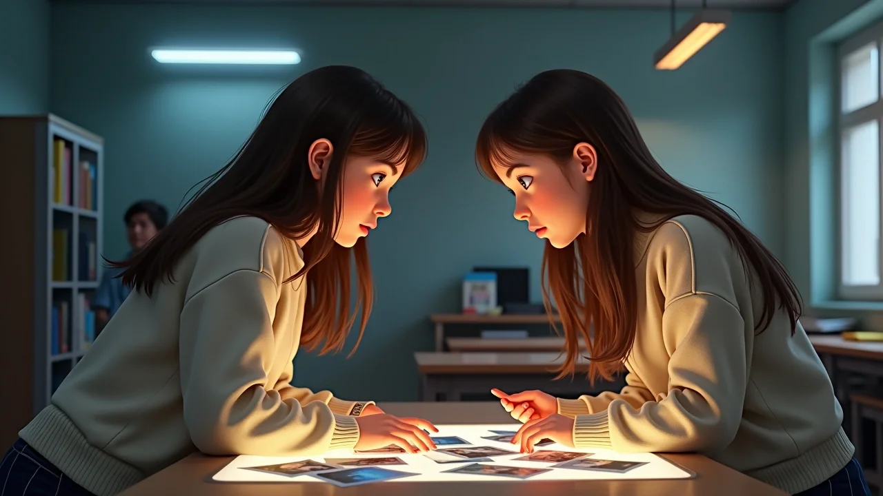 После уроков Ольга направилась прямо в медиацентр, где, как она знала, Наталья часто проводила время. Дверь была приоткрыта, и Ольга увидела Наталью, склонившуюся над компьютером, сосредоточенно просматривающую фотографии. Её тёмные волосы падали на плечи, а лучи заходящего солнца мягко освещали её профиль. Ольга на мгновение замерла, любуясь этой картиной.