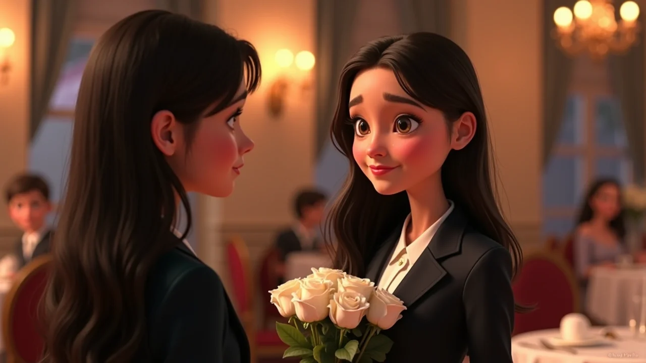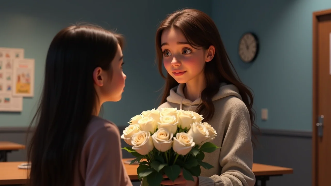 Наталья взяла букет, её руки слегка дрожали. Она смотрела на белые розы, затем на Ольгу. В её глазах читалась смесь шока, трогательности и того самого, невысказанного чувства, которое теперь стало ещё сильнее. Она чувствовала, как её сердце сжимается от нежности и… чего-то ещё, чего она боялась себе признаться. Белые розы были символом чистоты, невинности, но в то же время и глубокой, искренней любви. Ольга, стоящая перед ней, была уже не просто ученицей. Она была сильной, талантливой девушкой, которая не боялась своих чувств, несмотря ни на что.