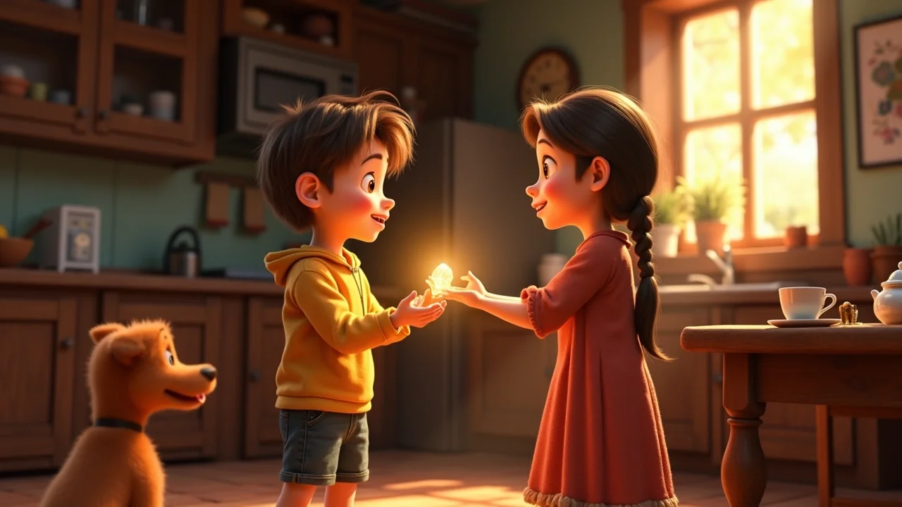 Максим, не в силах сдержать свои секреты, тут же вытащил из кармана тот самый переливающийся камешек. Он протянул его маме, и как только её пальцы коснулись гладкой поверхности, камешек вспыхнул ещё ярче, чем когда-либо! Свет был таким сильным, что на мгновение озарил всю комнату мягким, золотистым сиянием. Мама не испугалась, наоборот, её улыбка стала ещё шире, а глаза заблестели.