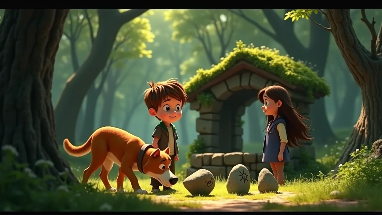 Они снова отправляются в путь. Тропинка, по которой они идут, петляет между вековыми деревьями, корни которых, словно змеи, извиваются по земле. Воздух становится прохладнее, а солнечный свет едва пробивается сквозь густую крону. Тоби, чуя что-то необычное, идёт впереди, осторожно обнюхивая каждый куст. Вскоре они выходят на небольшую поляну, в центре которой стоит старый, заросший мхом колодец. Его деревянный сруб покосился, а ведро, когда-то висевшее на цепи, давно сгнило. Вокруг колодца лежат три камня: один – гладкий и круглый, другой – острый и угловатый, а третий – с высеченным на нём символом солнца.