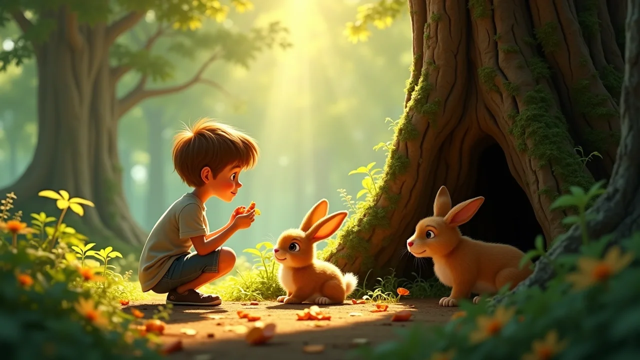 Максим осторожно присаживается на корточки перед норой. Тоби тоже садится рядом, тихонько поскуливая, словно сочувствуя Звёздному Зайчику. Максим протягивает руку, но зверёк лишь глубже прячется. Мама смотрит на сына с нежностью, но не вмешивается, зная, что это его испытание. Максим вспоминает слова дедушки о том, что доброта – это не только слова, но и поступки. Он начинает тихонько напевать песенку, которую ему пела бабушка, когда он был совсем маленьким. Песенка про солнышко и тёплый дом. Звёздный Зайчик выглядывает из норы, его ушки подрагивают. Максим достаёт из кармана кусочек сушёной морковки, которую бабушка дала ему на перекус, и кладёт её у входа в нору. Он терпеливо ждёт, не делая резких движений.