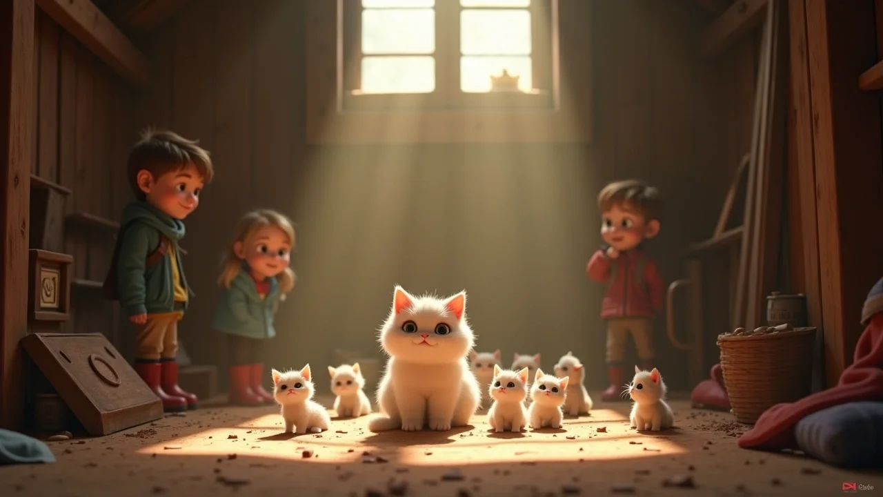 Василиса бросилась туда, и её глазам предстала удивительная картина. Пушок сидел в окружении маленьких, пушистых котят! Он выглядел немного испуганным, но в то же время гордым. А рядом с ним, на старом мешке, лежала целая коллекция блестящих предметов: бусины, пуговицы, осколки зеркала и даже несколько старинных монет. Среди них был и тот самый колокольчик, который он так крепко держал в зубах.