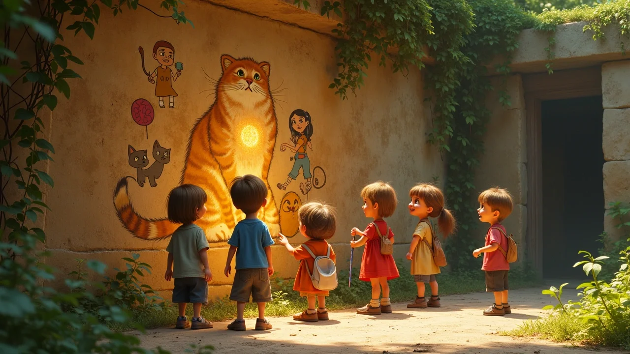 Василиса подошла ближе. Она осторожно провела рукой по холодному камню. На фресках были изображены люди, похожие на них, – дети, которые играли, смеялись и что-то строили. А в центре одной из фресок был изображён большой, пушистый кот, очень похожий на Пушка, окружённый маленькими котятами. Рядом с ним был нарисован клубок, который светился, и девочка с длинными косами, держащая в руках кисть.