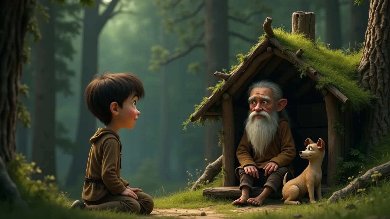 Собачка подошла к двери избушки и тихонько поскребла лапой. Дверь со скрипом отворилась, и на пороге появился старик. Он был высохшим, как старый пень, с длинной седой бородой, переплетённой с мхом, и глазами, глубокими, как лесные озёра. Это был Лесовик. Он выглядел очень уставшим и печальным, а его одежда, сотканная из листьев и коры, была пожухлой и тусклой.