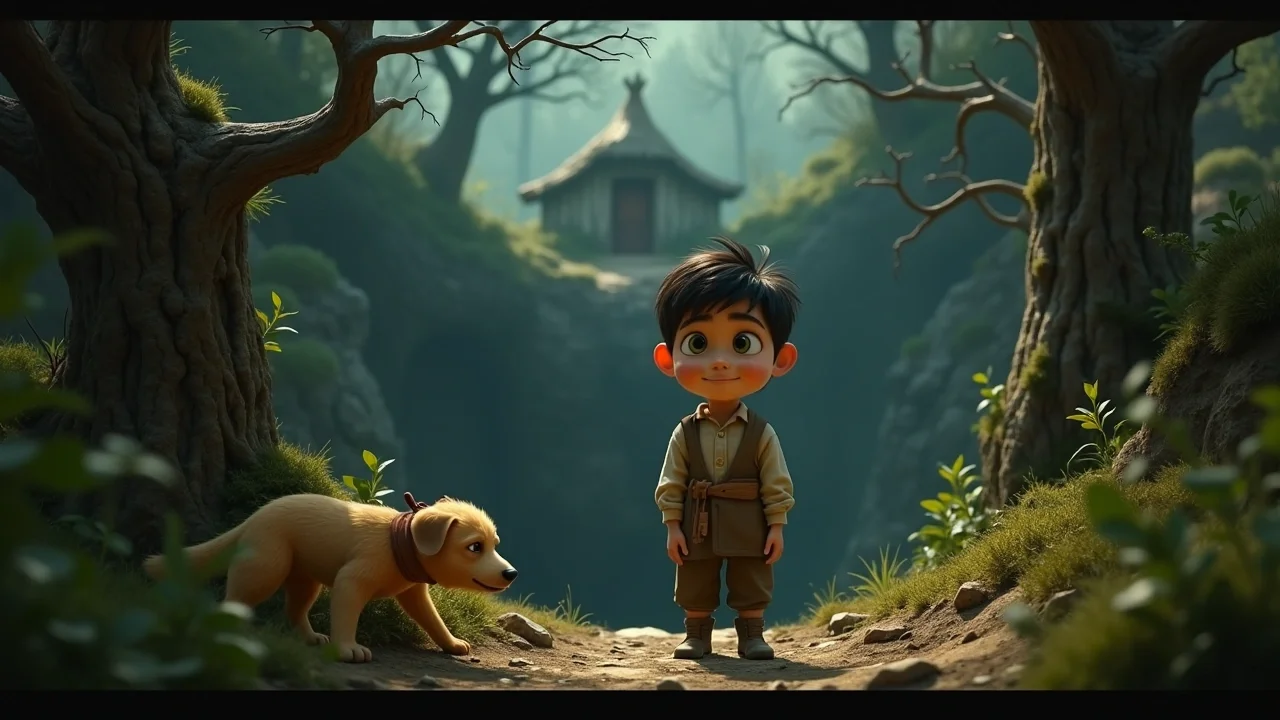 Яромир последовал за ней, стараясь ступать аккуратно по скользкой земле. Тропинка была крутой и извилистой, но собачка уверенно вела его, иногда останавливаясь и оглядываясь, чтобы убедиться, что мальчик не отстаёт. Наконец, они добрались до дна оврага, где стояла та самая избушка. Она была совсем маленькой, почти сливаясь с окружающими кустами и сухими ветками.