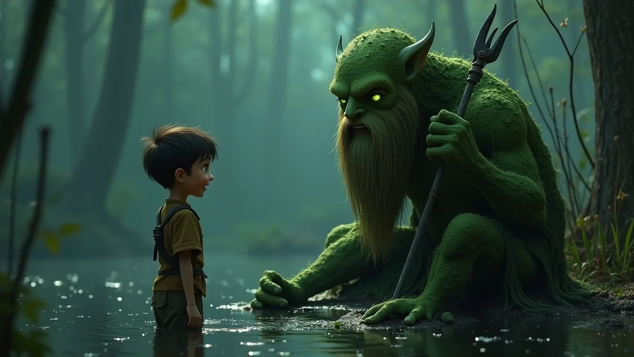 Наконец, сквозь туман он увидел очертания большого, тёмного озера. Это было Глубокое Озеро. Вода в нём была чёрной и неподвижной, как зеркало, отражающее лишь серое небо. На берегу, среди камышей, сидел Водяной. Он был огромным, покрытым тиной и водорослями, с длинной зелёной бородой и глазами, похожими на два болотных огонька. Он держал в руках трезубец и выглядел очень сердитым.