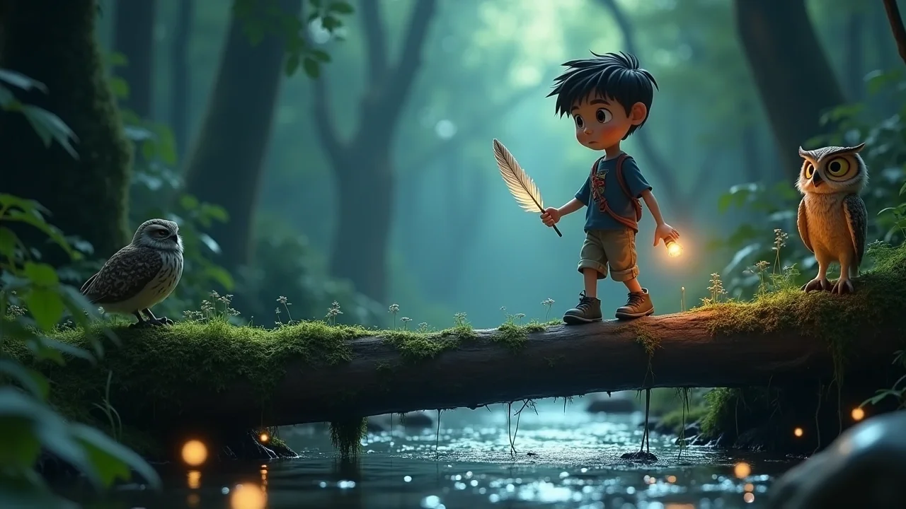 Он сделал первый шаг. Бревно было шершавым и пахло мокрым мхом. Артём шёл медленно, ставя одну ногу перед другой, как канатоходец в цирке. Когда он дошёл до середины, бревно слегка качнулось. Артём замер и крепко зажмурился. В этот момент он почувствовал, как невидимая, но тёплая волна спокойствия исходит от пера совы. Он вспомнил, что Глафира рядом, и что он здесь, чтобы помочь целому волшебному миру.
