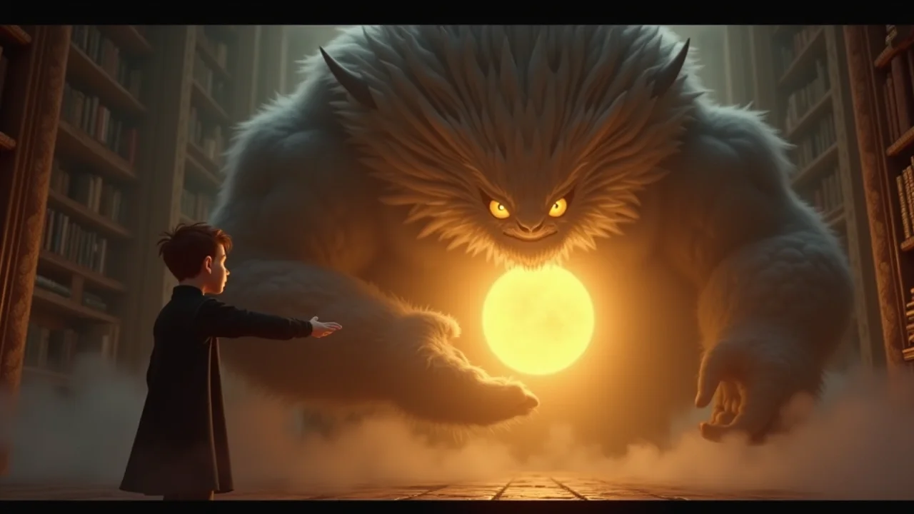 Вдруг мост вздрогнул. На другом берегу показалась фигура Тени Забытья — огромного существа, похожего на старую пыльную тучу, которое питалось скукой и отсутствием веры в чудеса.
