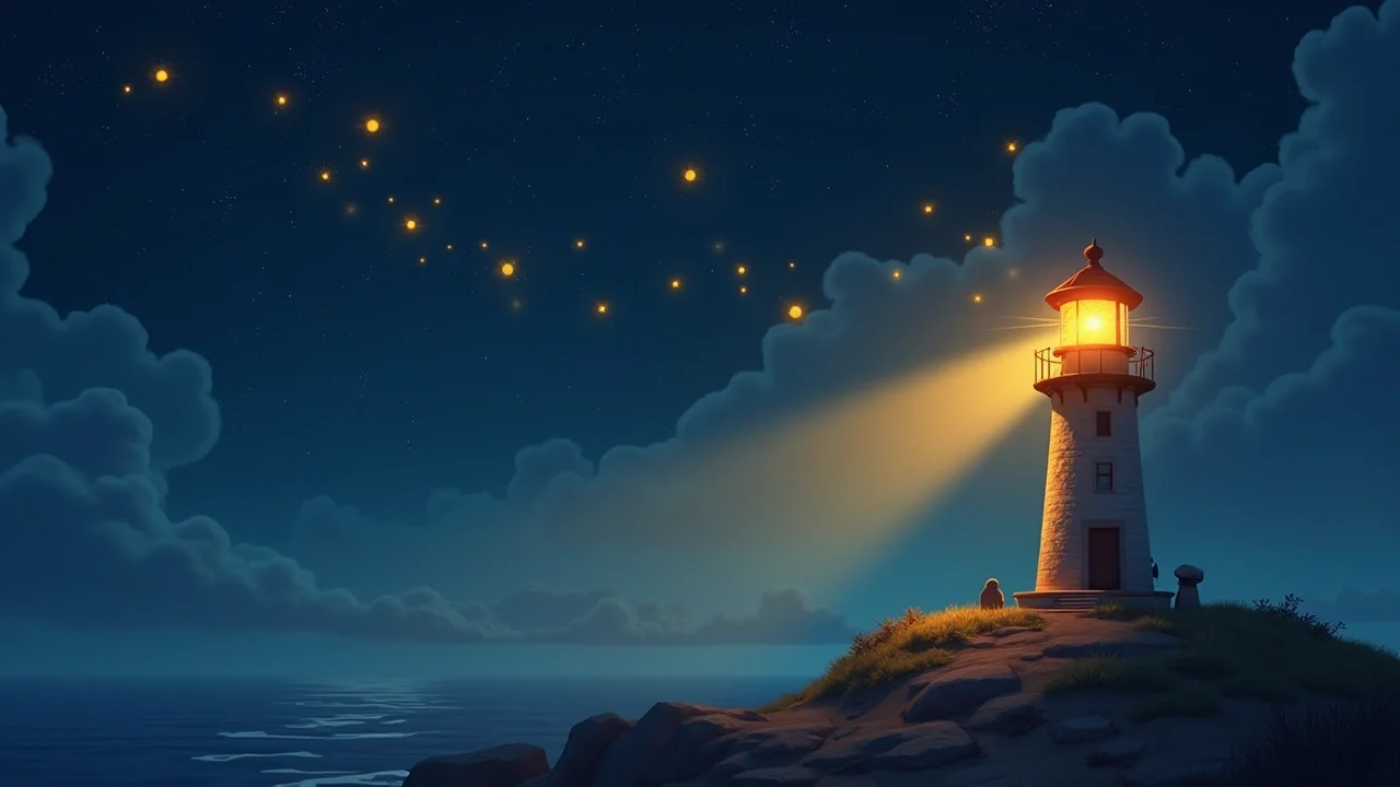 Маяк отозвался мгновенно. Из его вершины в небо ударил ослепительный столб золотого света. Он рассыпался на миллионы созвездий, которые начали оживать: небесный Медведь заворочался, Лебедь взмахнул крыльями, а Звёздный Дракон выпустил струю искрящегося пламени. Весь мир вокруг наполнился цветом и жизнью.
