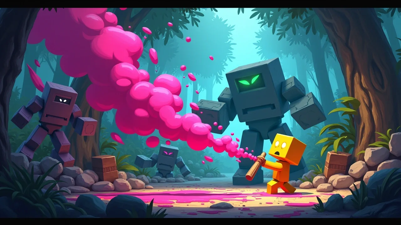 — Получай порцию вдохновения! — хохотал Ананас, приземляясь на ветку гигантского квадратного дерева. Он начал носиться между големами, оставляя за собой яркие шлейфы. Вскоре всё поле боя превратилось в гигантский холст. Големы, чьи оптические сенсоры были залиты густой краской, начали дезориентировано махать руками, задевая друг друга и смешно сталкиваясь лбами.